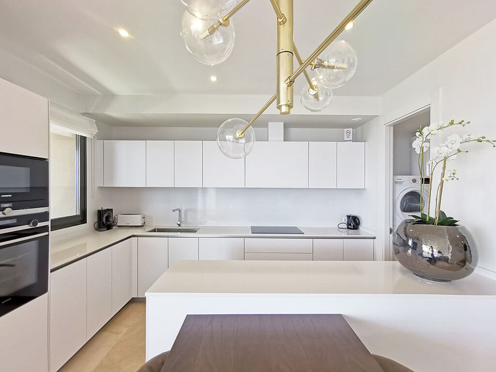 The open plan living space comprises a fully fitted kitchen is equipped with Siemens appliances, and a dining and seating zone. The space is bathed in natural light by provided by floor to ceiling windows with recessed frames for seamless lines, allowing you to soak up the magnificent views from any angle, inside or out. As befitting this calibre contemporary Cabopino apartment, features include a home automation system and air conditioning throughout. The property benefits from 2 underground parking spaces, and a store room.